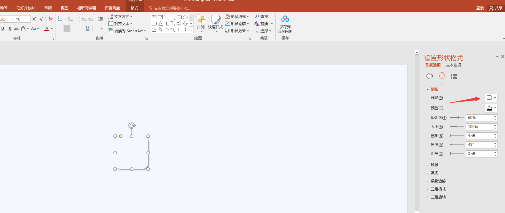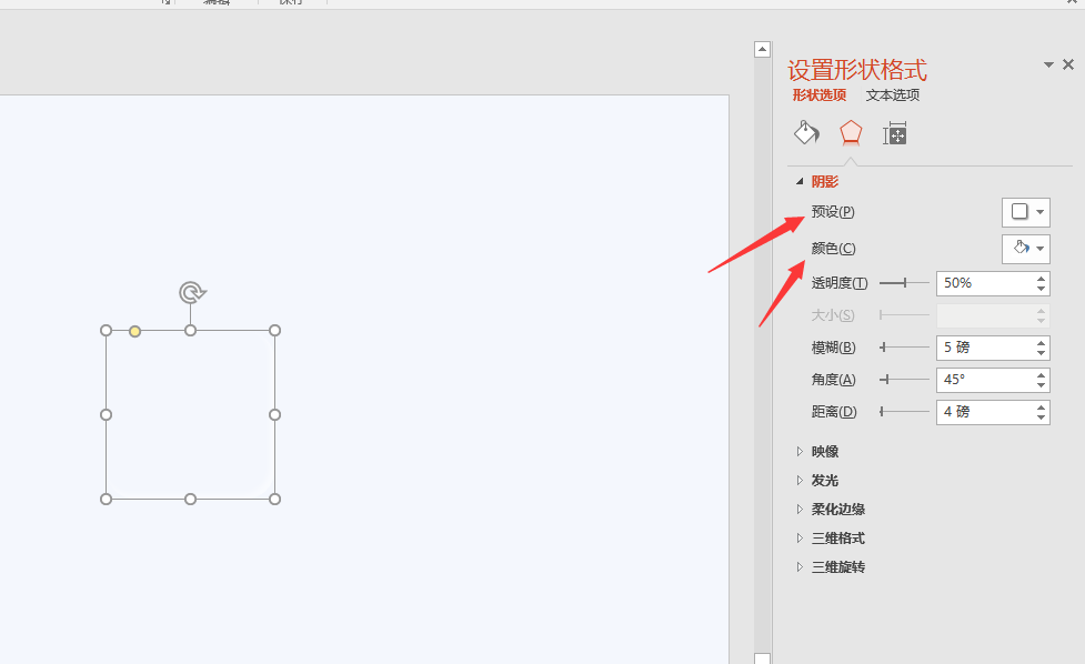 第一步:插入一个小矩形,右键设置形状格式-填充颜色选择跟PPT背景色一样的颜色-线条选择无线条-阴影效果选择外部右下斜偏移-然后调整一下阴影的大小;