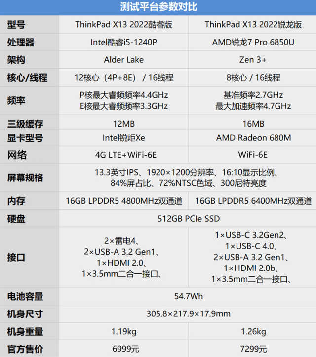 今天我们分别选择了搭载英特尔第12代酷睿i5-1240P处理器和搭载AMDPro6850U处理器的两台主打移动办公的联想ThinkPadX13来进行对比测试。之所以选择这两款产品,是因为ThinkPad笔记本电脑一直以来稳定耐用、安全可靠的口碑,在移动办公领域极具代表性。同时通过对比电商平台,两款产品在价格上也极为接近,这让本次测试更为公平(目前京东上搭载i5-1240P的价格是6999元,而R7Pro6850U是7299。)