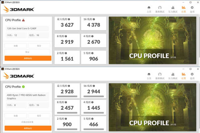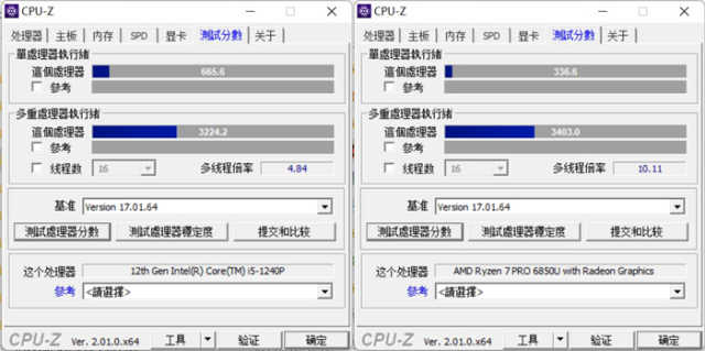 首先看一下CPU-Z自带的基准测试。插电状态下,酷睿i5-1240P单线程分数为666.3、多线程分数为5299.4;锐龙76850U单线程分数为576.8、多线程分数为4540.8。