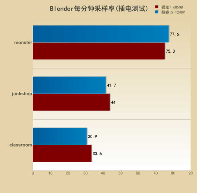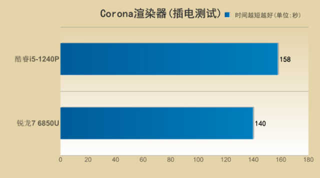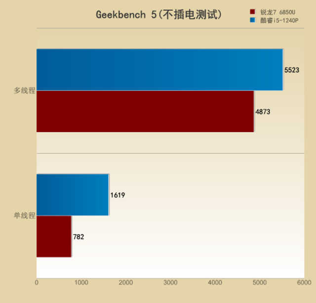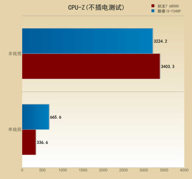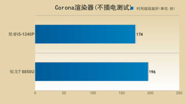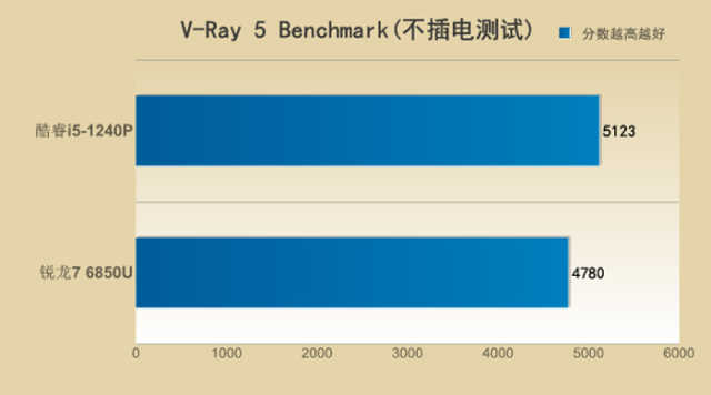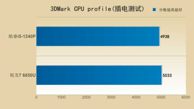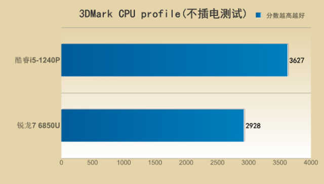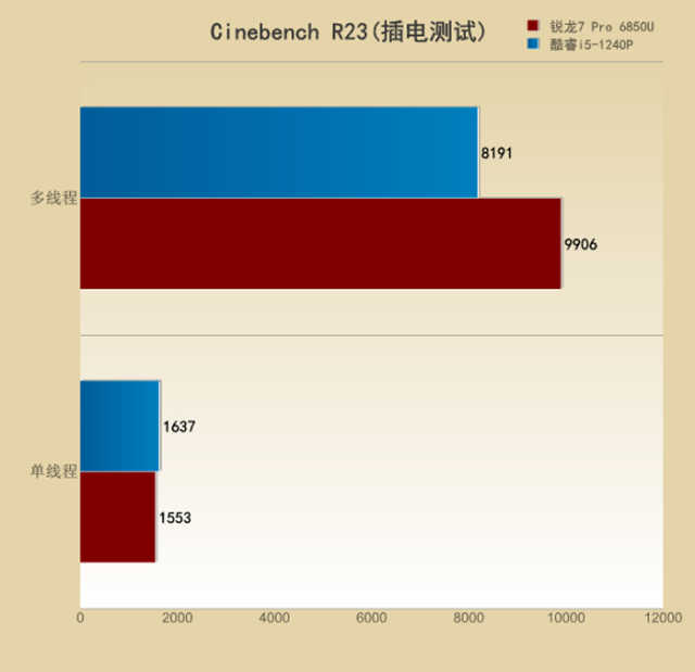 不插电状态下,则还是酷睿i5-1240P表现出了其优势的一面,领先锐龙76850U23%之多。