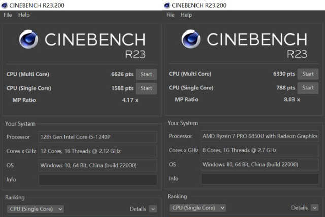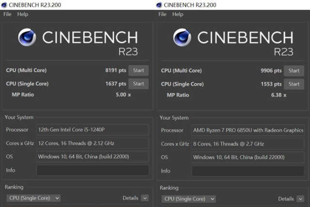 CinebenchR23跑分中,插电状态下,锐龙76850U单核心分数为1553,多核心为9906。酷睿i5-1240P在多核心与锐龙76850U相差不多,分数为8191,单核心方面二者也基本持平。