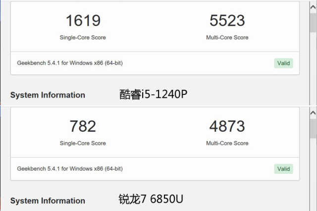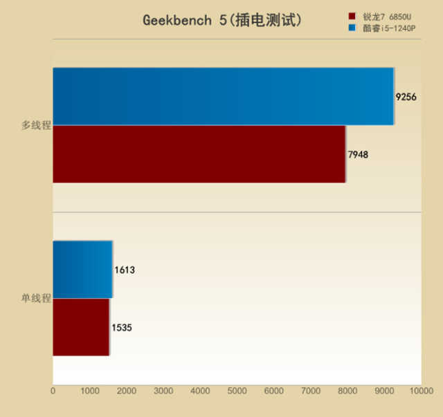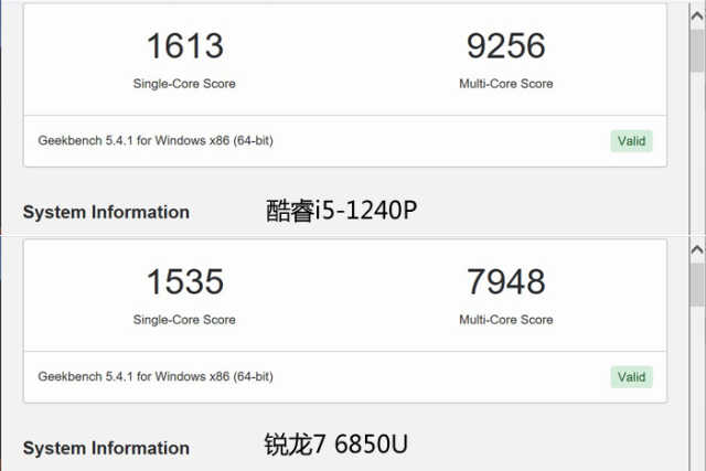 Geekbench5是一个支持跨平台运行的基准测试软件,插电状态下酷睿i5-1240P单核心分数为1613,多核心分数为9256。锐龙76850U单核心分数1535,多核心分数则为7948。酷睿i5-1240P单核心领先5%,多核心领先13%。