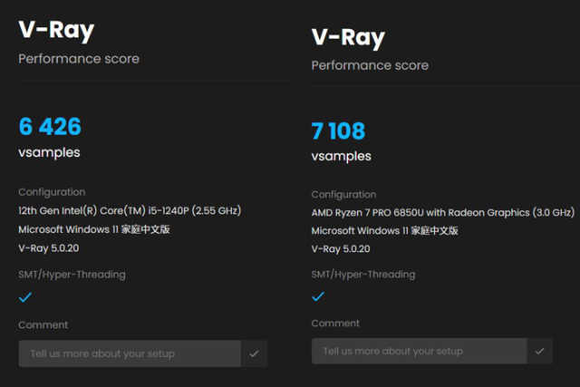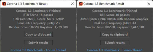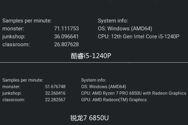 此环节,在插电状态下,二者的渲染时间很接近,锐龙76850U用时较少。