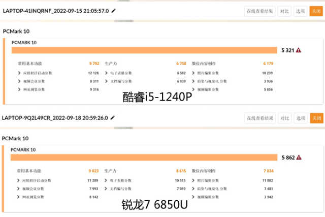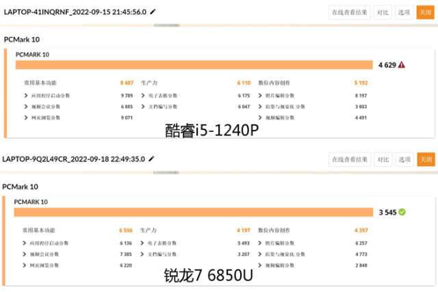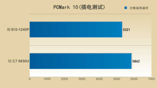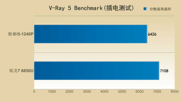 此环节的插电测试下,酷睿i5-1240P得分为6426,锐龙76850U得分7108,锐龙76850U反超了酷睿i5-1240P大约10%。