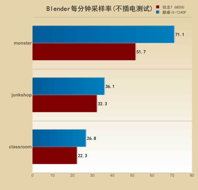 不插电状态下,酷睿i5-1240P反超对手,渲染效率更高。