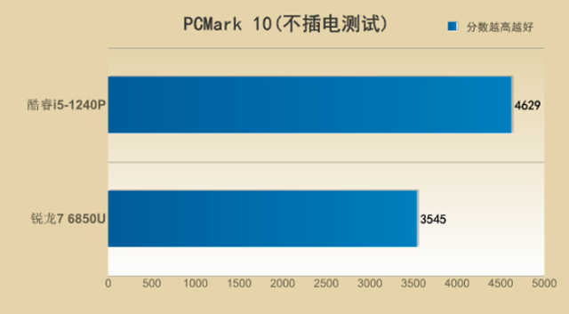 不插电状态下,酷睿i5-1240P依旧维持领先,总体得分高于锐龙76850U14%。