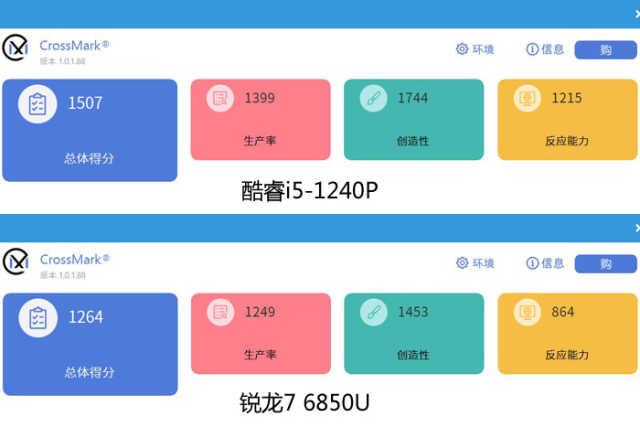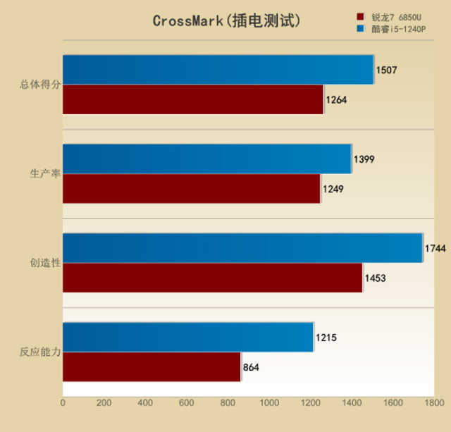 在插电状态下,酷睿i5-1240P总体分数为1507、生产率分数为1399、创造性分数为1744、反应能力分数为1215;与之对比锐龙76850U总体分数为1264、生产率分数为1249、创造性分数为1453、反应能力分数为864,酷睿i5-1240P全面领先。