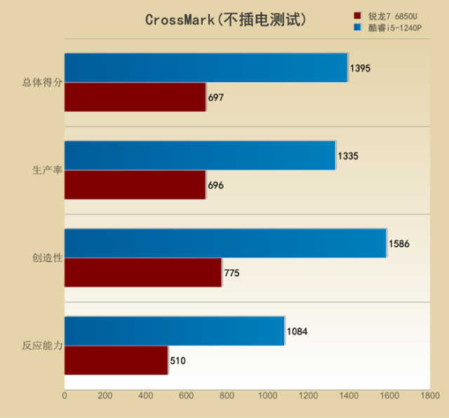 但是在不插电状态下,依旧是酷睿i5-1240P的强项,其相较锐龙76850U有7%的领先优势。