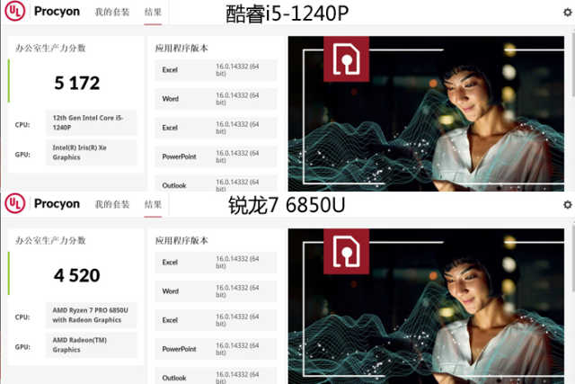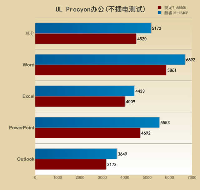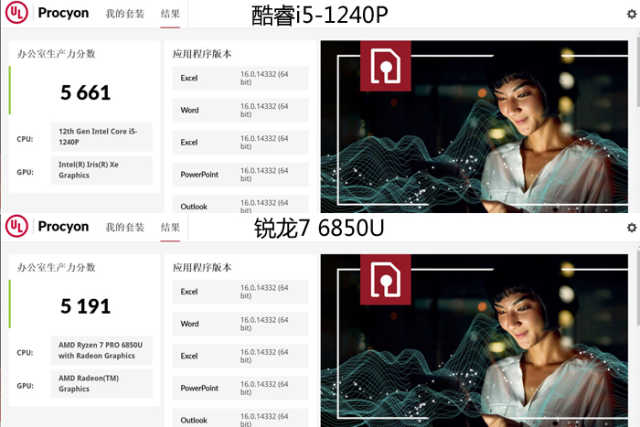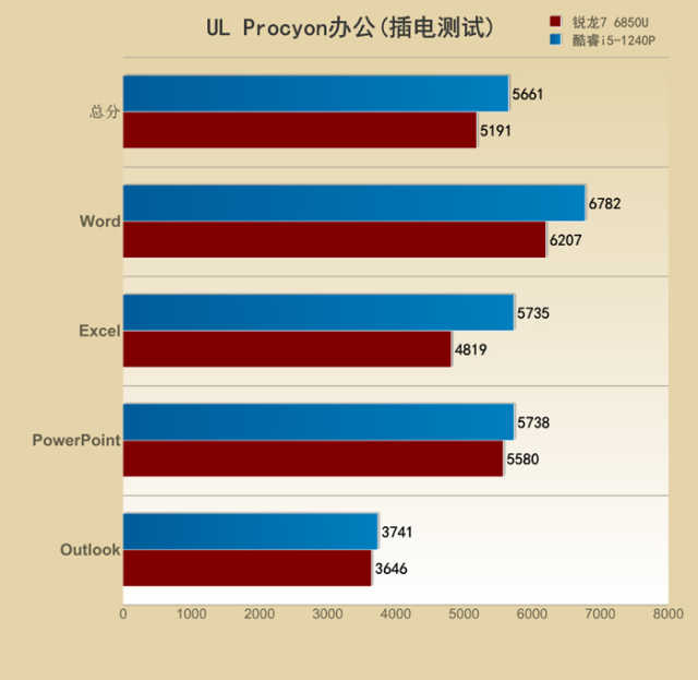 锐龙76850U得到了5191的总分,其中Word为6207、Excel为4819、PPT为5580、Outlook为3646。