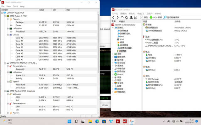 锐龙76850U烤机10分钟后,温度稳定在72℃,功耗23W左右,全核频率在2.7Hz左右浮动,整个过程中释放表现平稳。