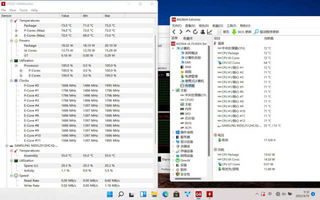 酷睿i5-1240P在烤机10分钟后,此时温度71℃,功耗稳定在19W左右,P核频率在1.6GHz,E核频率1.3GHz。