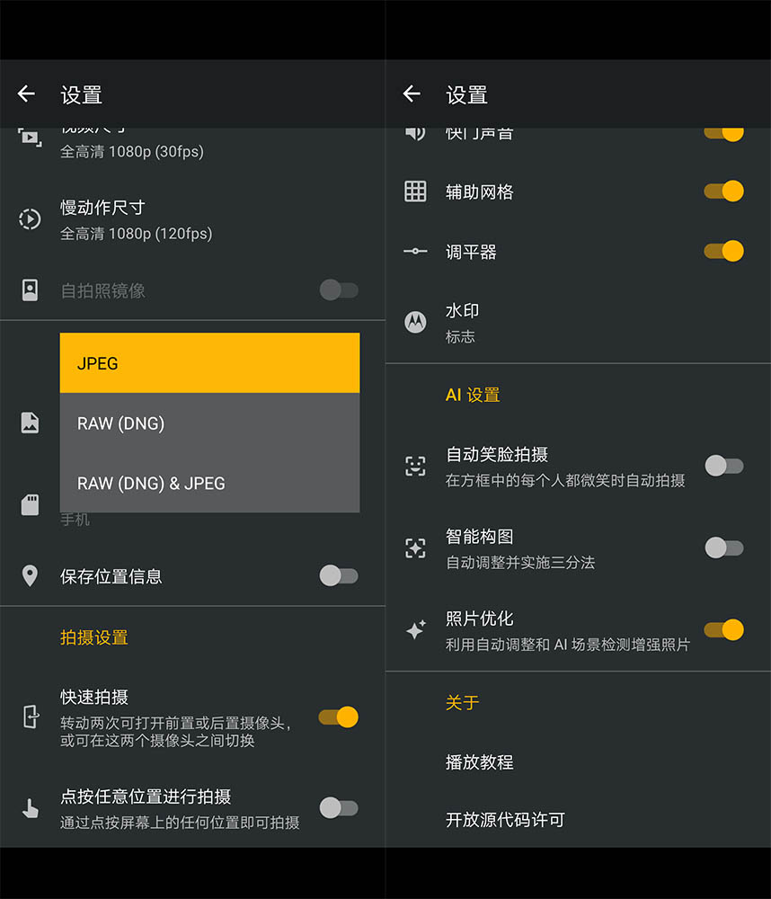 一些基础功能,如AI摄影、人像虚化、夜景模式、手机水印等摩托罗拉p50均有。但它也有一些别人没有的拍摄功能,如“专色”功能、RAW格式输出、水平提示器、自动笑脸拍摄、智能三分法构图等。