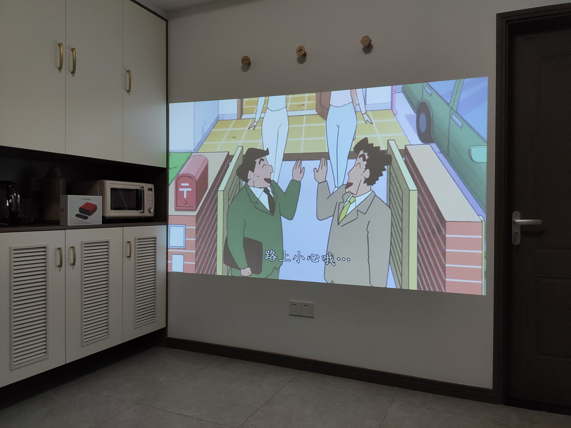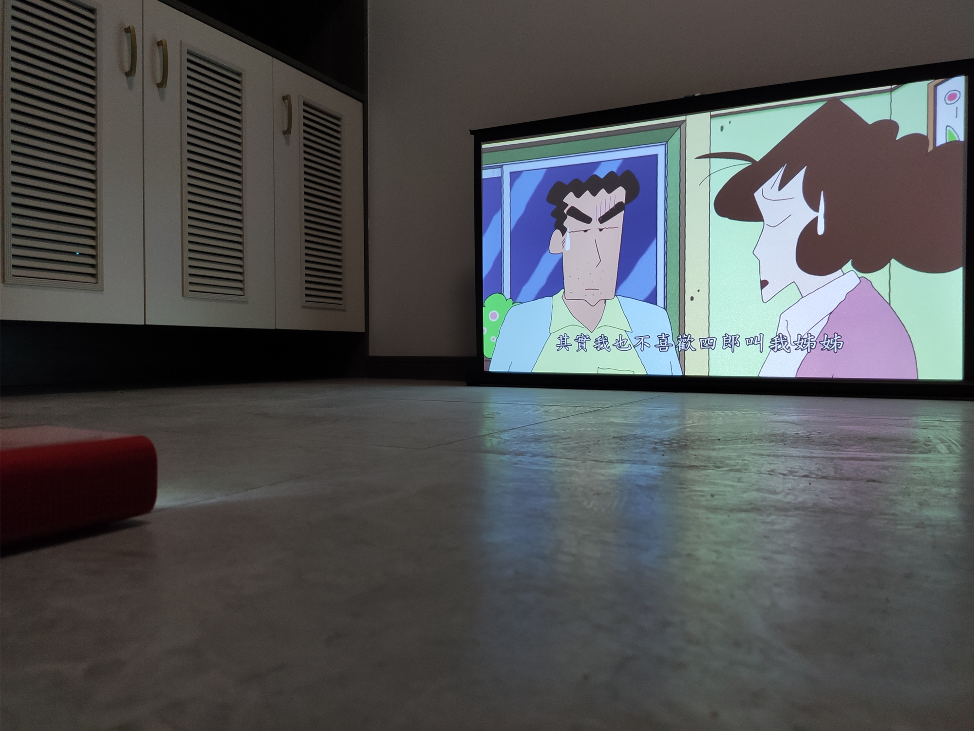 另外,投影仪这类产品离被投射墙壁或者幕布越远也就能够投射出更大的画面来,这一点对于被屏幕尺寸固定的电视机而言,很明显投影仪的优势更大,能够随心所欲自由调整投影画面的大小。上图的投影效果就是将“小红盒”向后移动一点距离后可以明显看到投影画面变得更大了。