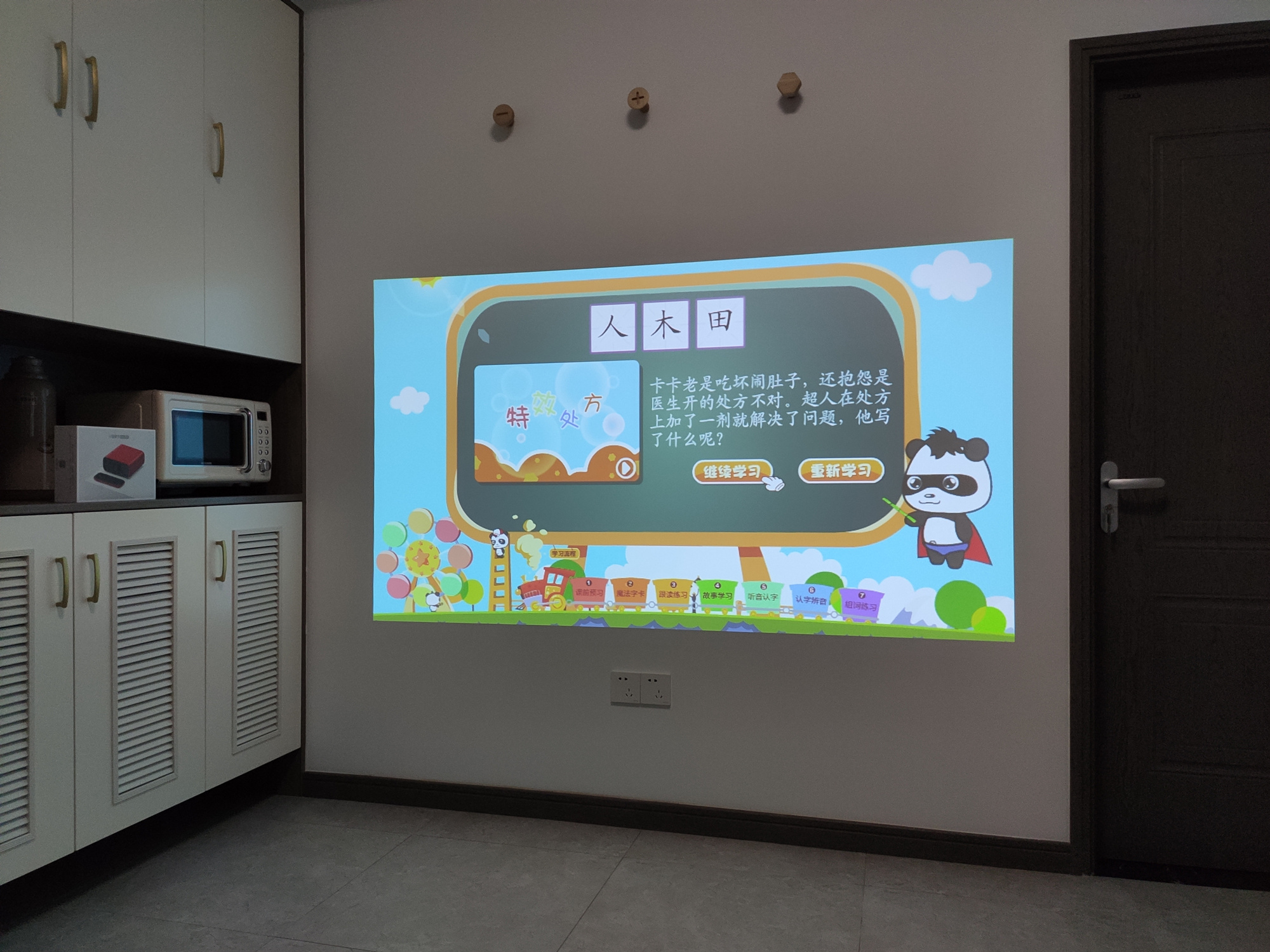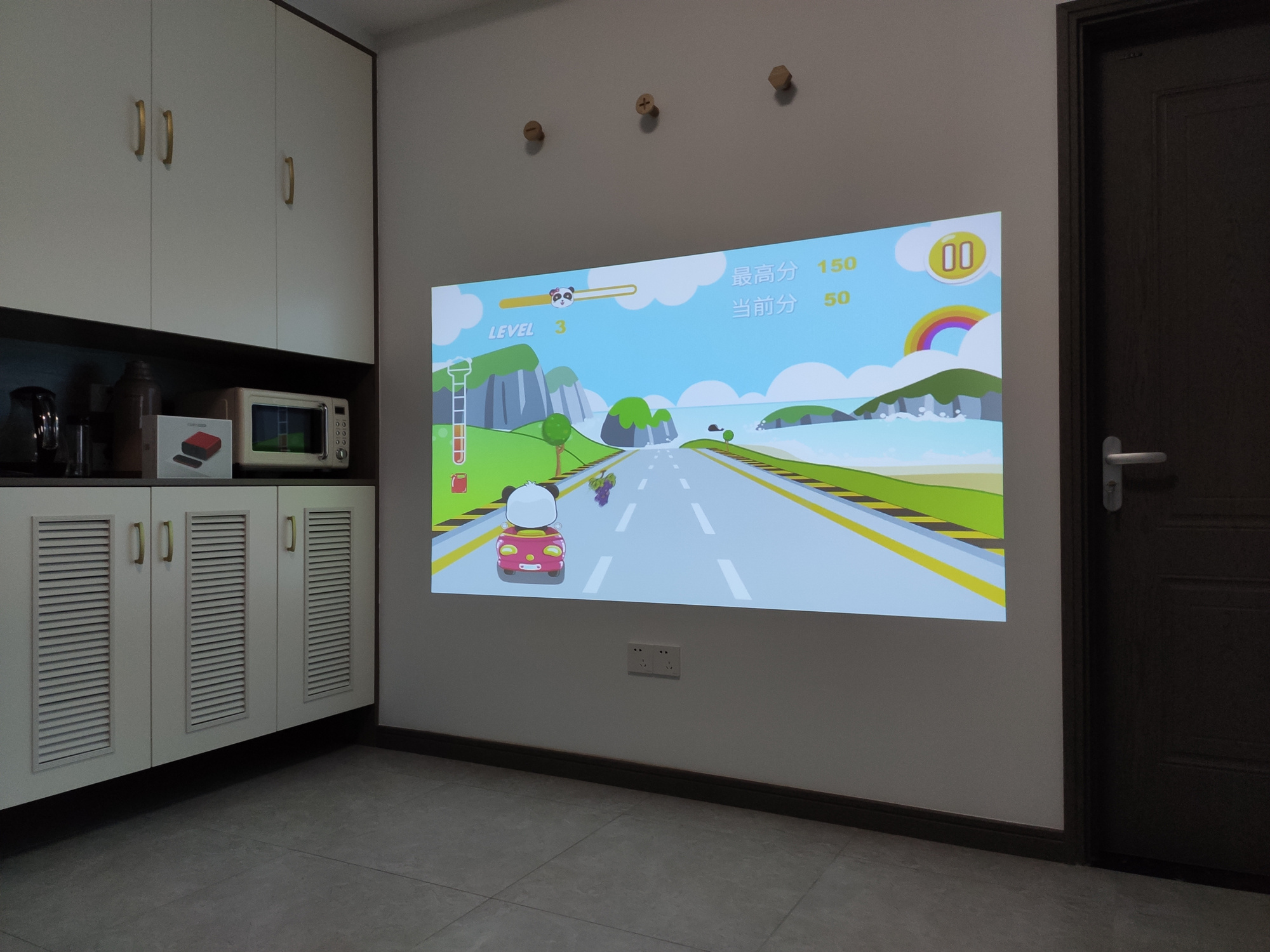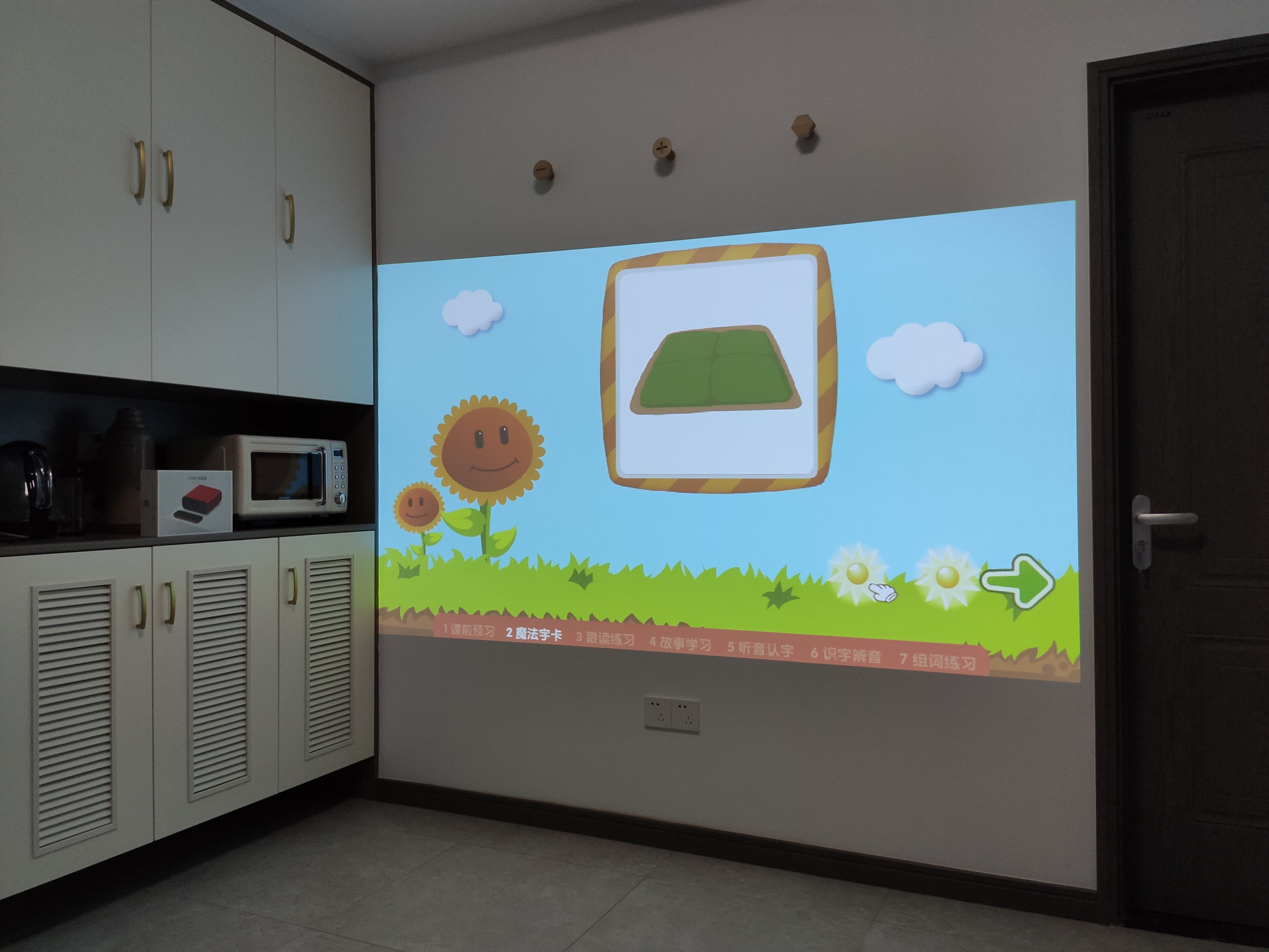 因为搭载了智能系统,所以“小红盒”除了可以用来观影外,你也可以安装一些第三方应用例如:早教、游戏、唱K等应用来体验,上图就是“小红盒”运行早教应用的投影效果。对了,因为投影仪是漫反射成像原理,所以较于液晶屏幕而言,投影画面会在一定程度上减少对眼睛的伤害。