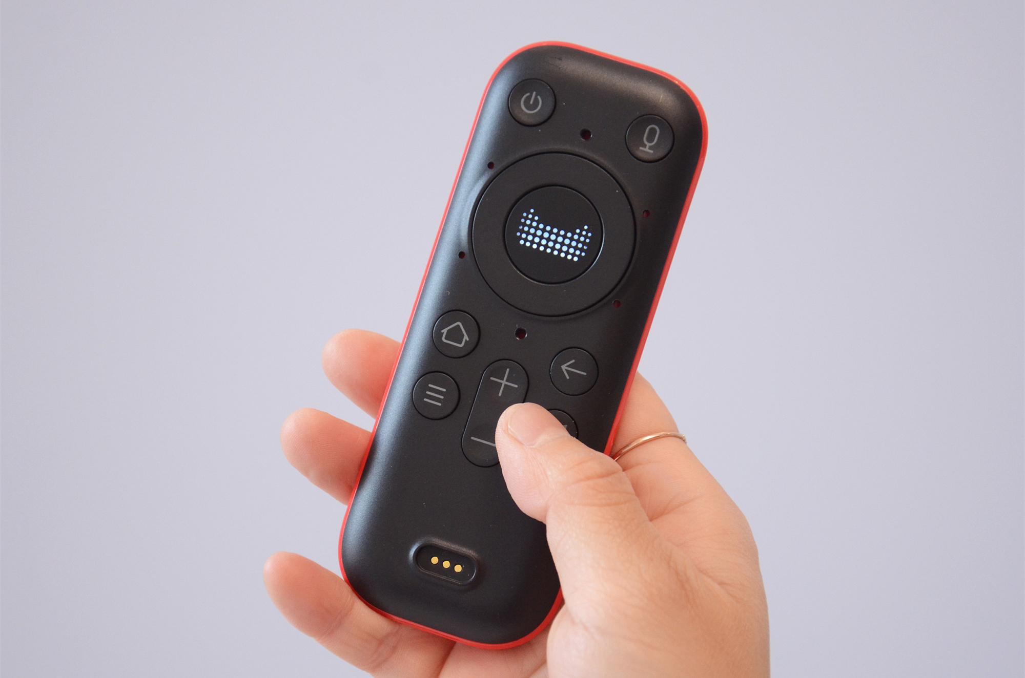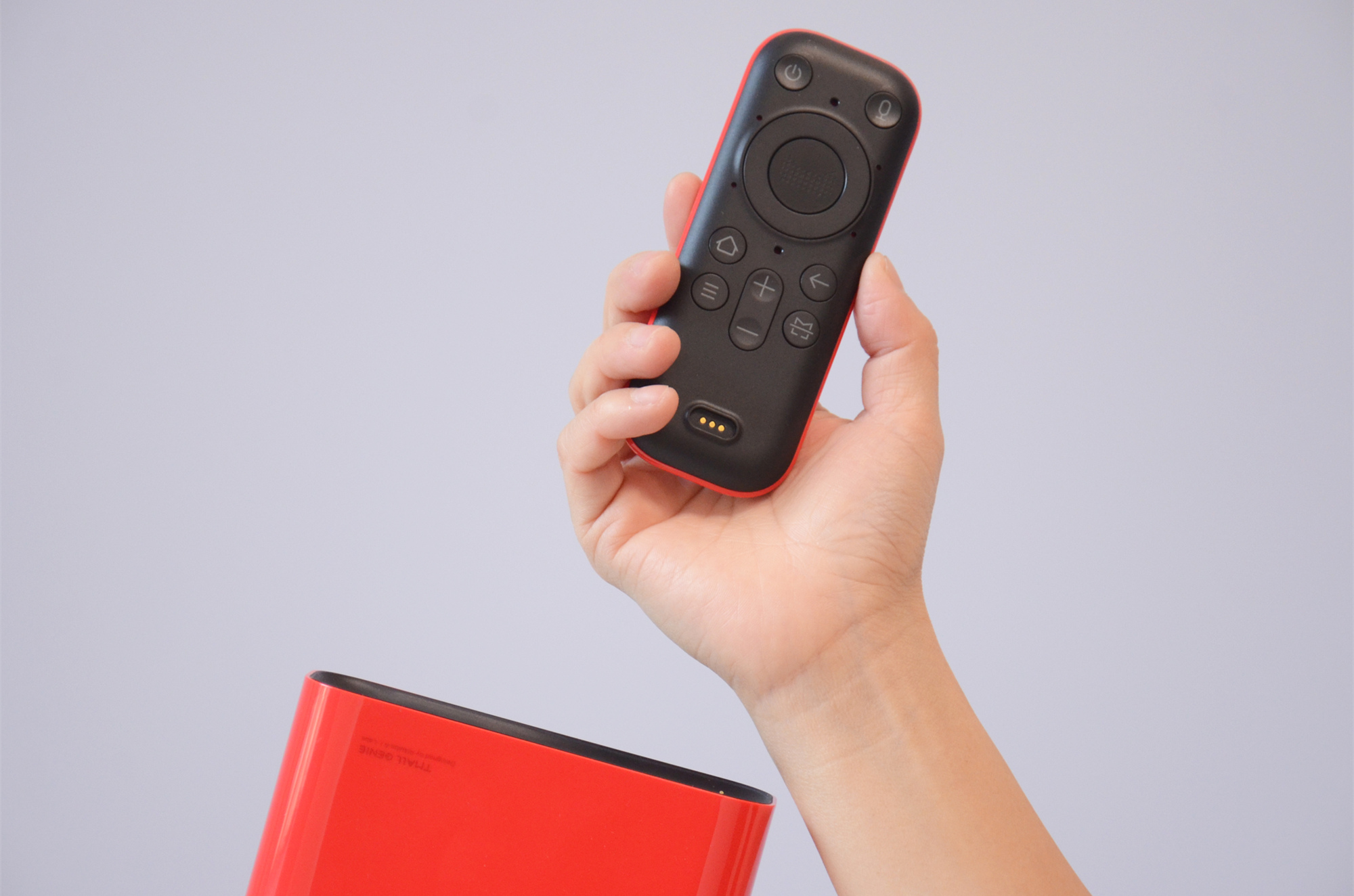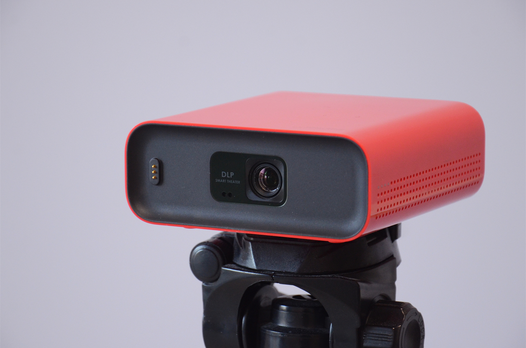 取下吸附式遥控器后就能看到“小红盒”的投影镜头,上图投影镜头左边的磁吸式触点就是之前提到可以为遥控器充电的触点。