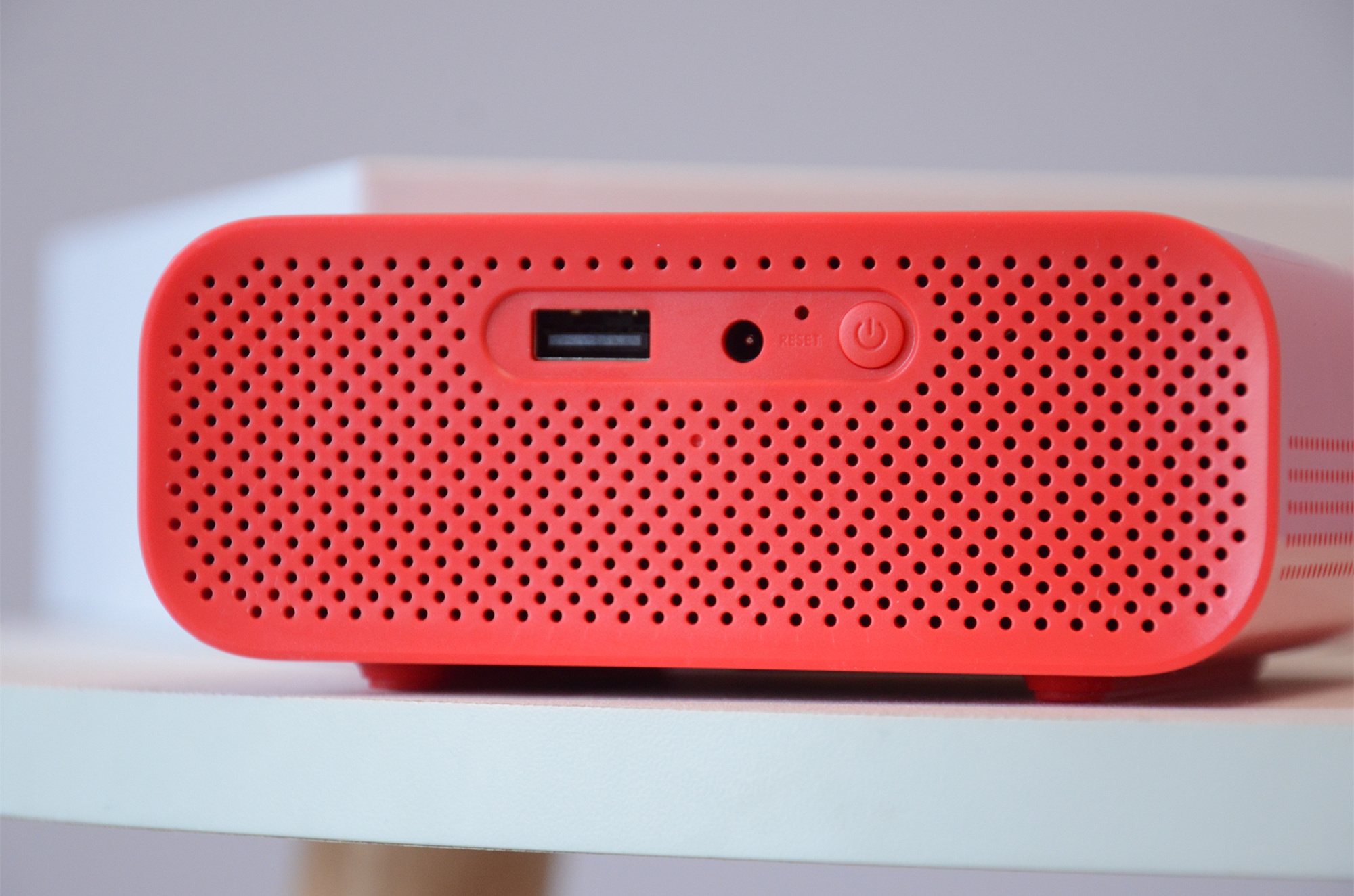 天猫精灵“小红盒”智能投影仪尾部设计实拍,可以看到尾部设有一个USB接口、一个电源接口及电源开关。