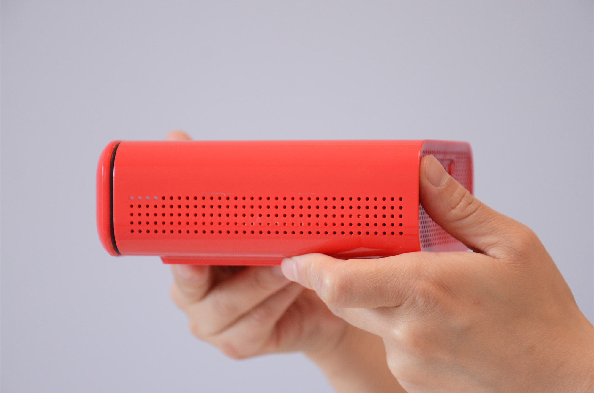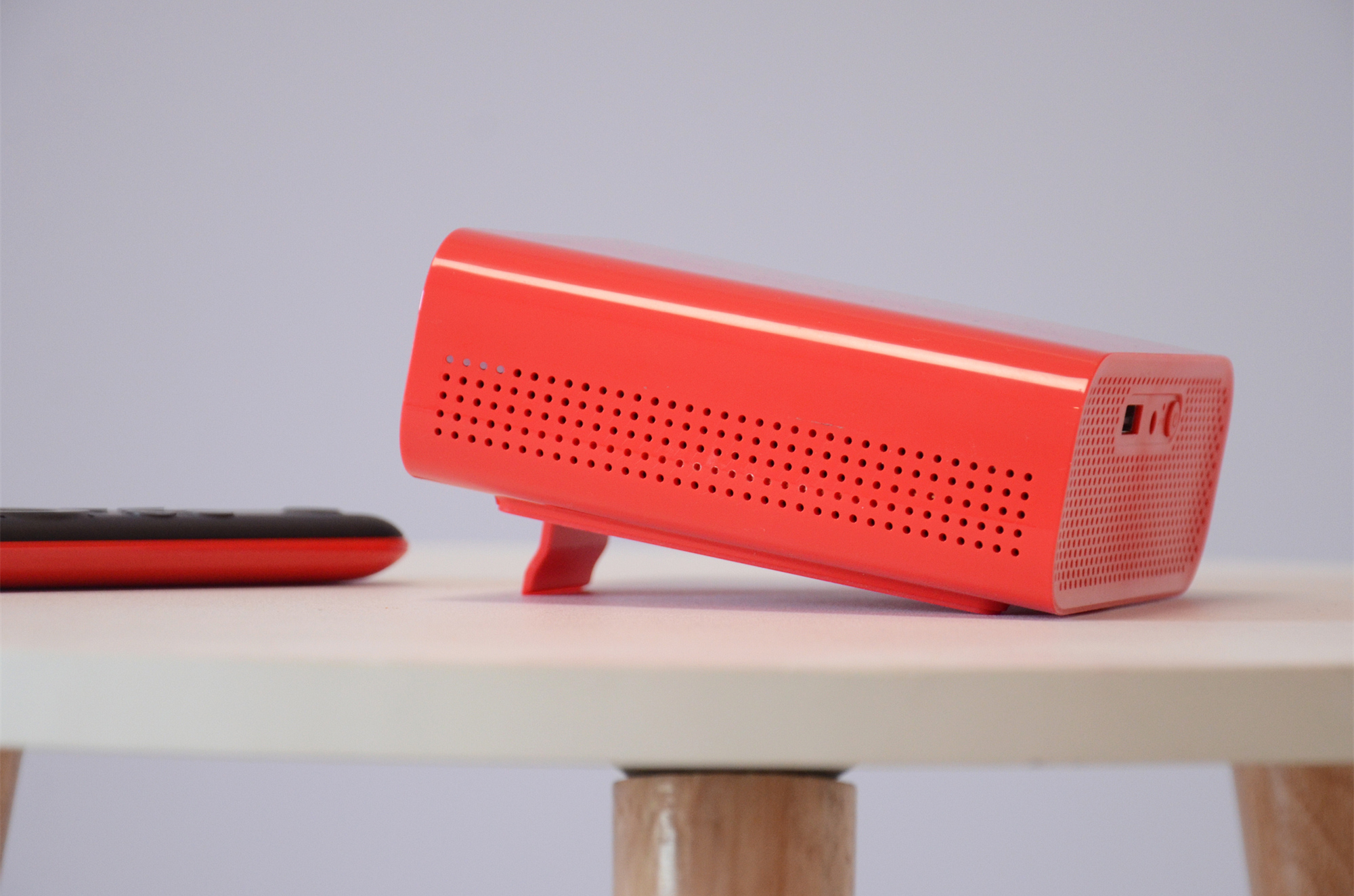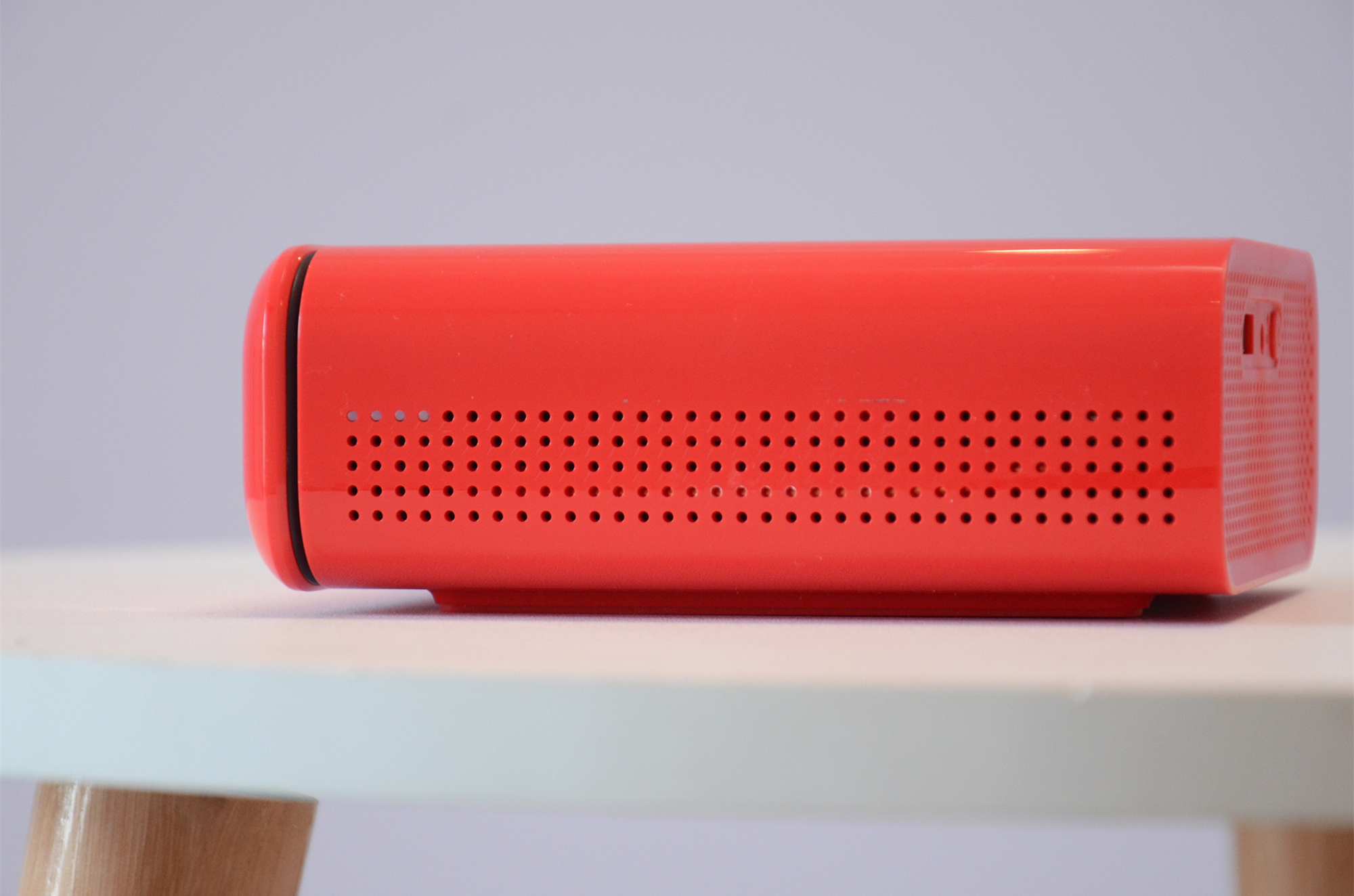 对了,因为天猫精灵“小红盒”智能投影仪可以不插电源使用,所以为了区分剩余电量,“小红盒”在机身侧面规则状的散热孔中有四个小孔设计成了电量指示灯。