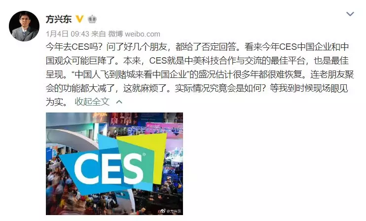 在CES正式开幕的三天前,博客中国创始人方兴东发微博道:“预估今年CES中国企业和中国观众可能出现剧降。”