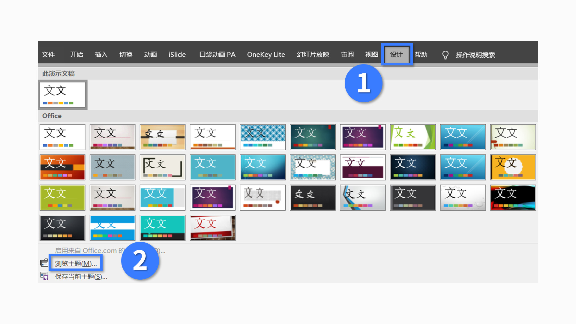 选中【设计】-【主题】-【浏览主题】,选择你需要的模板后,点击【应用】,这样就成功套用进去啦!版式的调整方法同前面一样,这里就不过多阐述了~