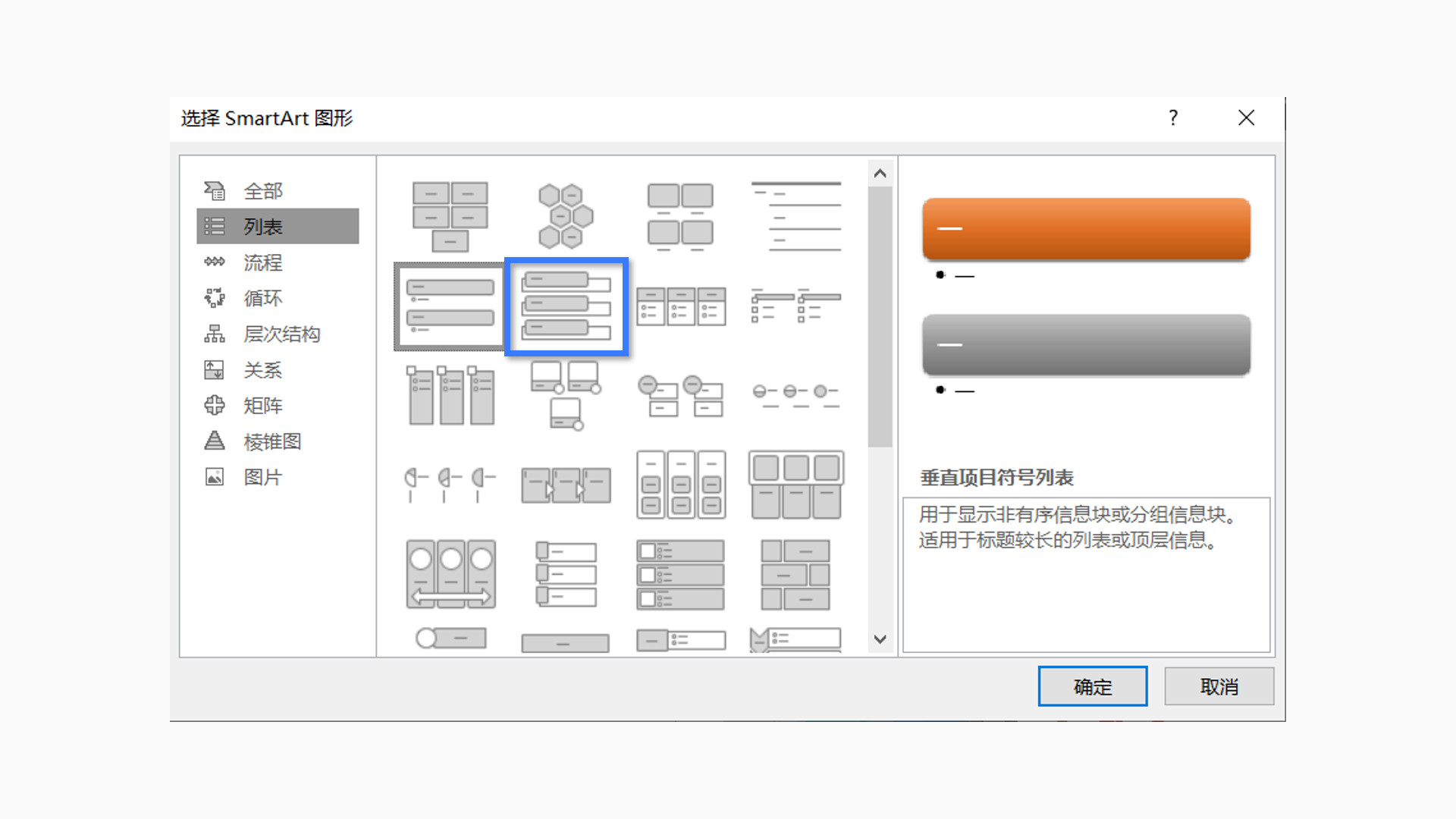 用鼠标框选中文本之后,右击并选择【转换为smartart】,在smartart图形中选择【垂直项目符号列表】: