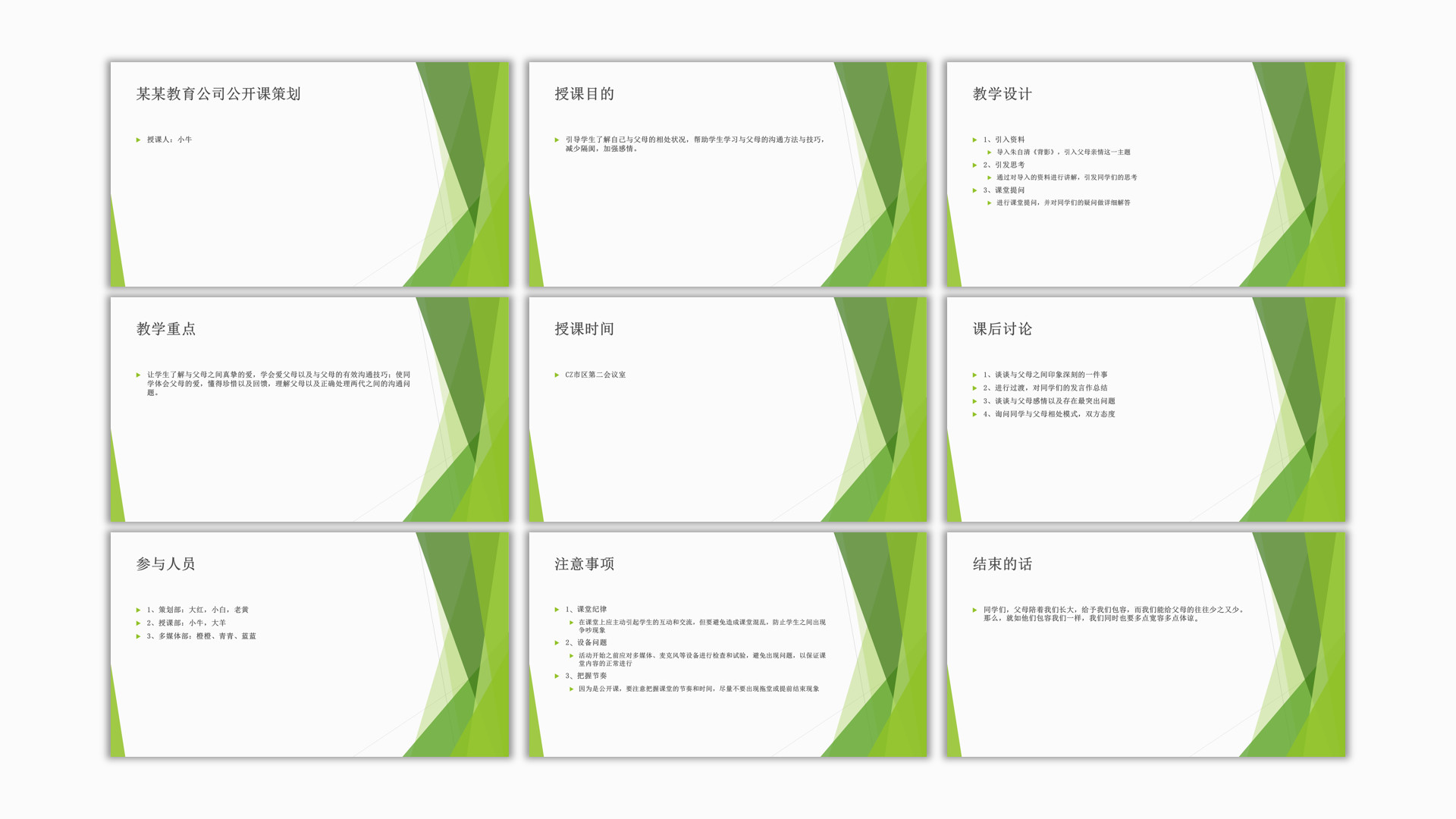 点击【设计】,在【主题】中选择一个套用进来,以第一行中这个绿色的主题为例,点击之后,“咻”的一声,PPT马上就变得不一样了~