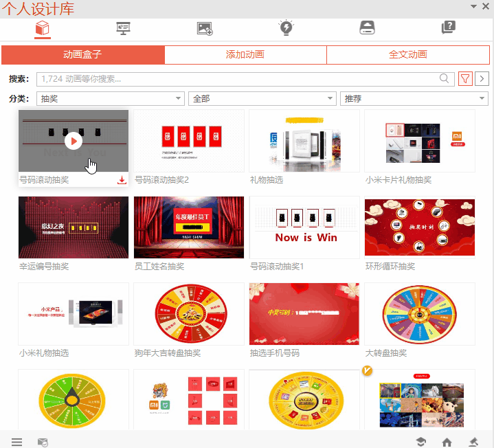 在里面就会有非常多的抽奖动画供我们选择,我们只要选择后下载到PPT中就可以了。