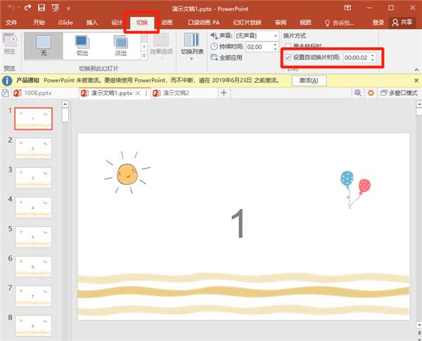 当我们将抽奖的内容都做好以后,我们就可以点击【切换】,然后勾选【自动换片时间】,根据自己的节奏设置每一张PPT的切换时间。在设置好以后,我们就点击【全部应用】就可以了。