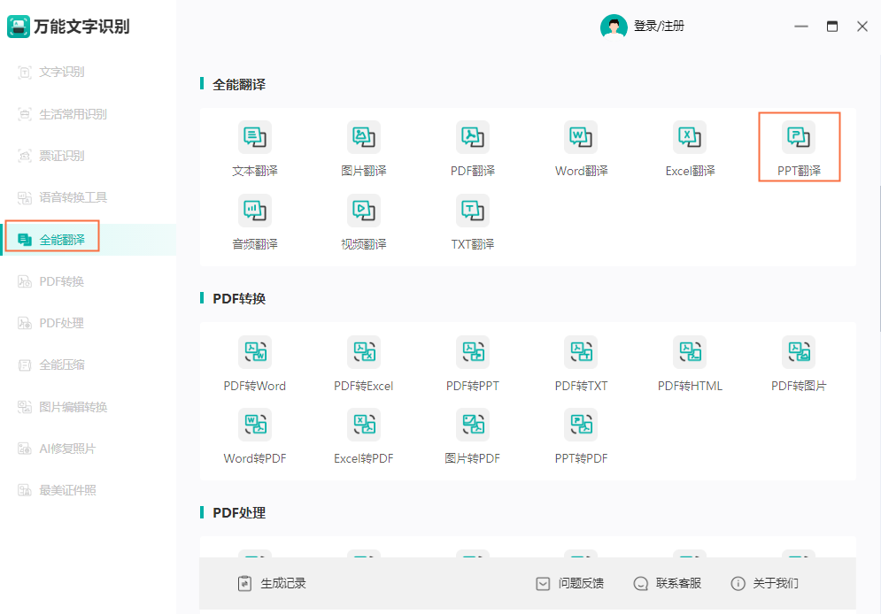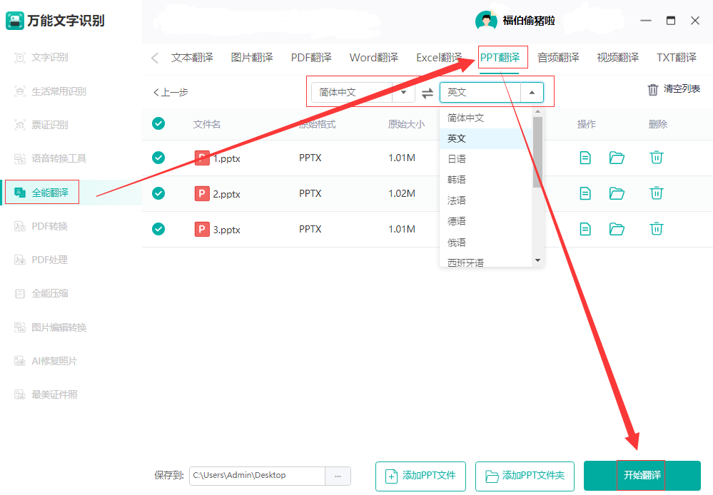 我们可以借助它的【全能翻译】里的【PPT翻译】来进行下面的操作。