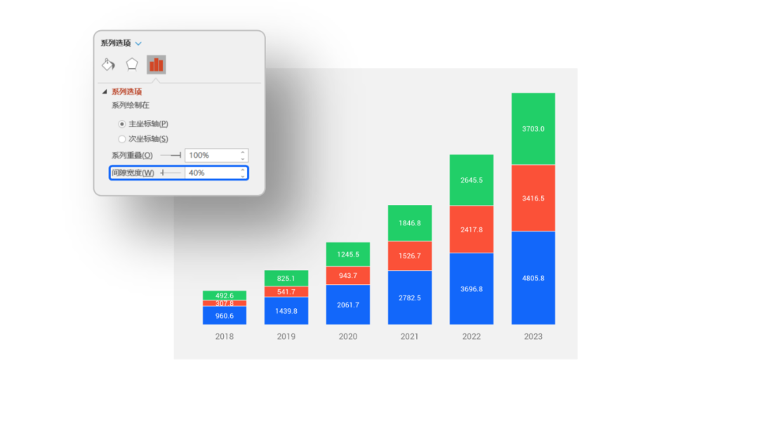 然后,调整柱状图的间隙宽度,让图表紧凑一些:
