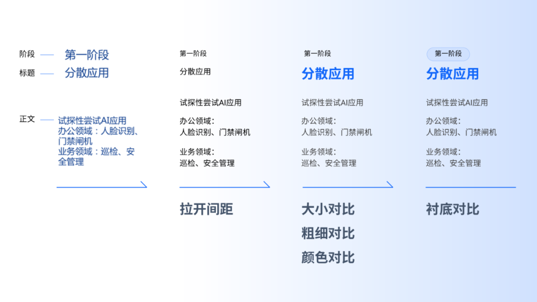 利用距离、大小、粗细、颜色、衬底对比,强化文本之间的层次关系: