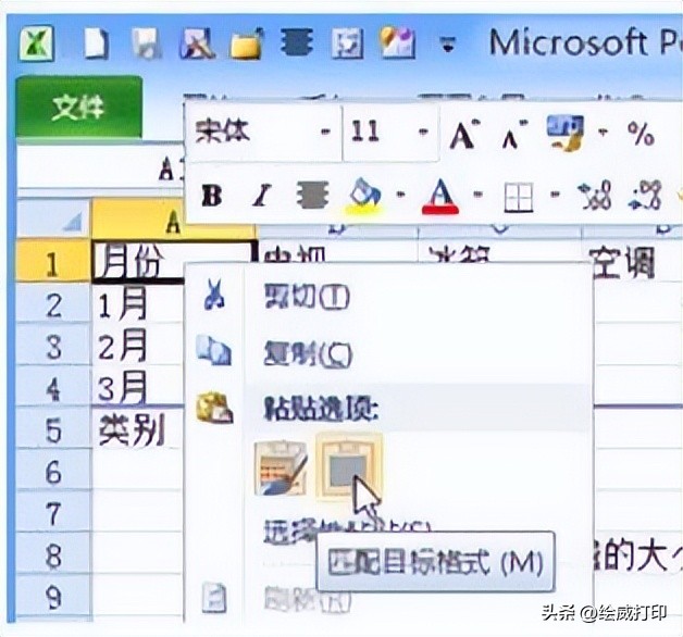 3.4 、然后鼠标右击A1单元格,在弹出的文本框中选择“粘贴选项”,点击“匹配目标格式”即可
