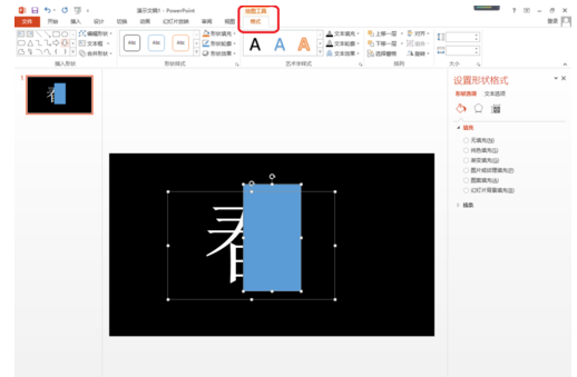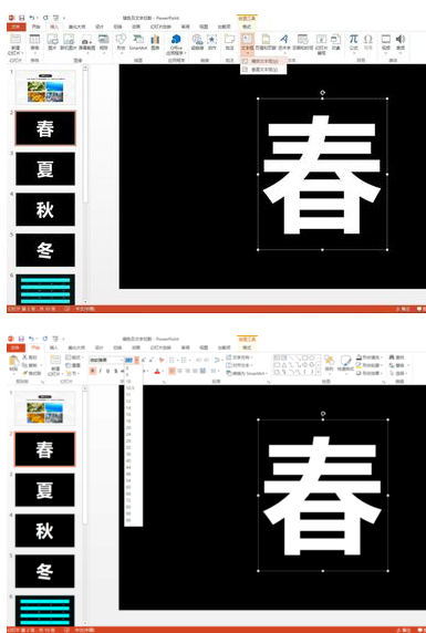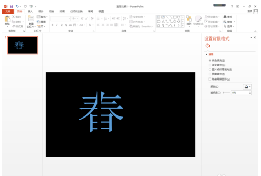 2.一起来看下吧首先打开PPT2013,点击插入--文本框--横排,输入一个文字--选择该文字--点击开始--字体大小自己输入287(大小由自己定)再点击插入--形状--长方形--用长方形把春字遮挡住一半