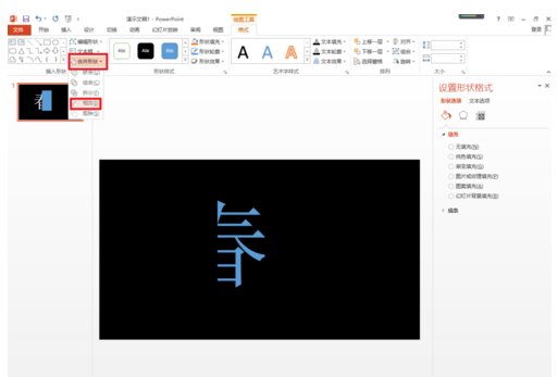 3.然后把字和形状图片全部选中,这时就是自动出现格式工具栏选项选中后,在格式的工具栏那里点击合并形状——选择相交,这样就把相同的部分显示出来,达到分离一半字体的效果