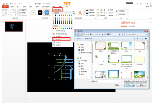 4.按照上述的方法制作另一半的春字,然后把这两半个春字移近在一起,然后选择另一半春字——点击形状填充——图片——双击:从文件——然后选择电脑中的图片进行填充