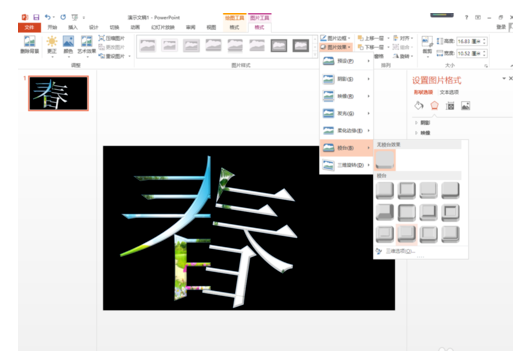 6.按步骤4的方法用图片填充另一边的春字,然后通过拖拉或者旋转鼠标调整春字的大小的形状,然后点击图片效果,设置图片的阴影或三维效果等