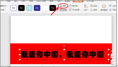 再次选中文字框内的文字,在开始菜单下调整字体的颜色,字号至合适大小,然后再次选中矩形,选择绘图工具下的填充按钮,把填充色改为红色,如图3