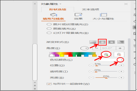 然后再插入一个圆,点击屏幕右边的窗口设置圆的颜色,填充颜色选择为渐变颜色,渐变样式选择第二个,然后点击角度后面的增加按钮,增加颜色的个数,每增加一个选择一个色标颜色,如图6