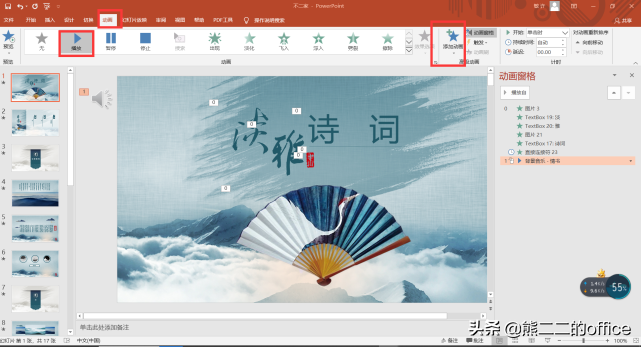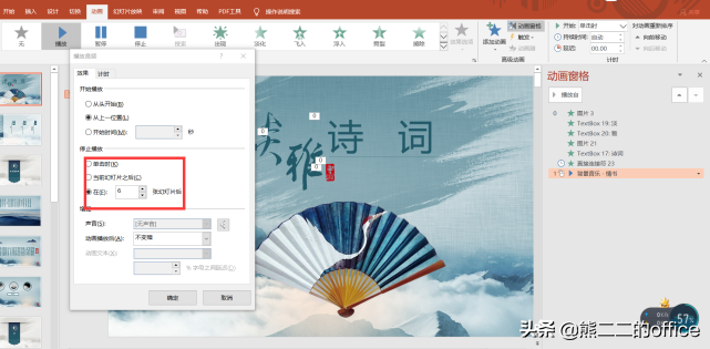 1.①点击插入选项卡②点击插入音频③插入pc上音频点击插入音频后,选项卡上会多出几个选项①开始②跨幻灯片播放③循环播放,直到停止如果想要播放幻灯片时,插入的音频一直循环播放,就将②③前面的小框框打上勾(不循环就不打勾勾)如下图所示那么因为情景需要,我就想固定的几个页面有音乐,那又怎么做呢?首先,按上述方法插入音乐,在第一张插入音乐,然后,点击动画选项卡——动画窗格对应元素——鼠标右键——效果选项——设置数字(我这里想要从第一张,播放到第六张,所以数字填6)这样,我们就可以给我们的幻灯片插上我们喜欢的音乐啦
