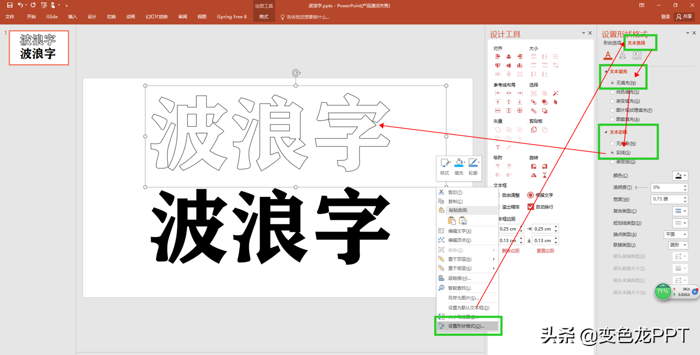2.1、首先输入想要的文字,复制粘贴一份2、接着先选中第一个文本框,右键点击设置形状格式,选择文本选项,文本填充选择无填充,文本边框选择实线,效果图如下