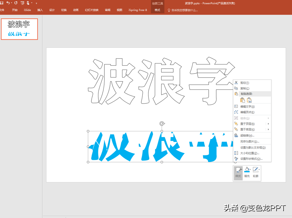 3.3、然后选中第二个文本框,准备插入波浪形状,在形状中选择曲线这个绘图工具4、画出一圈波浪的形状,5、按住ctrl选中文字和波浪形状,找到格式中的合并形状,选择相交,就只留下带有波浪的文字6、最后给文字填充上自己喜欢的颜色7、挪动文字与镂空字重合,将蓝色部分放至最底层,8、这样波浪字体就完成了