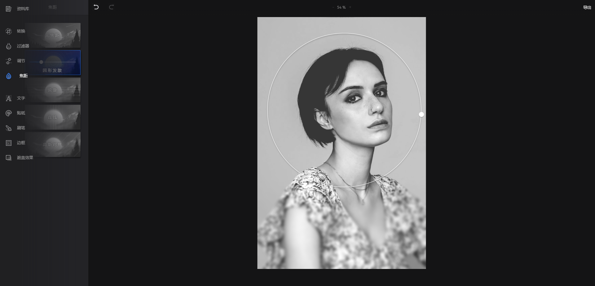 例如下图,小编更换滤镜后,选中【焦距】--【圆形发散】,圈外的部分做虚化处理,大家就会将焦点汇聚在小姐姐漂亮的脸庞上了。