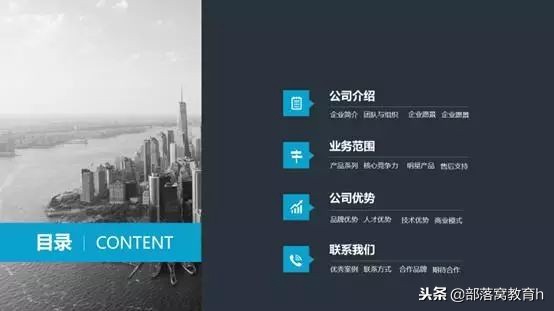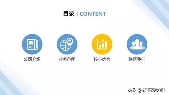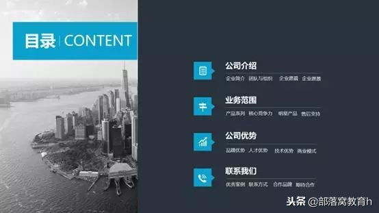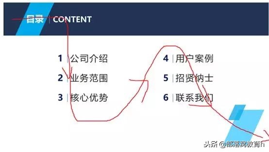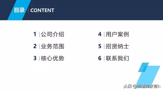 首先会被页面的深蓝色吸引(他是页面中最重的颜色,又符合人们从左上往右看的习惯),又因为深蓝色长色条制造出了颜色的重复,天蓝的平行四边形则顺应谱出差异化,瞬间捉住你的眼球,告诉你这页是——目录(竖线和英文只是起到修饰丰富页面的作用)…