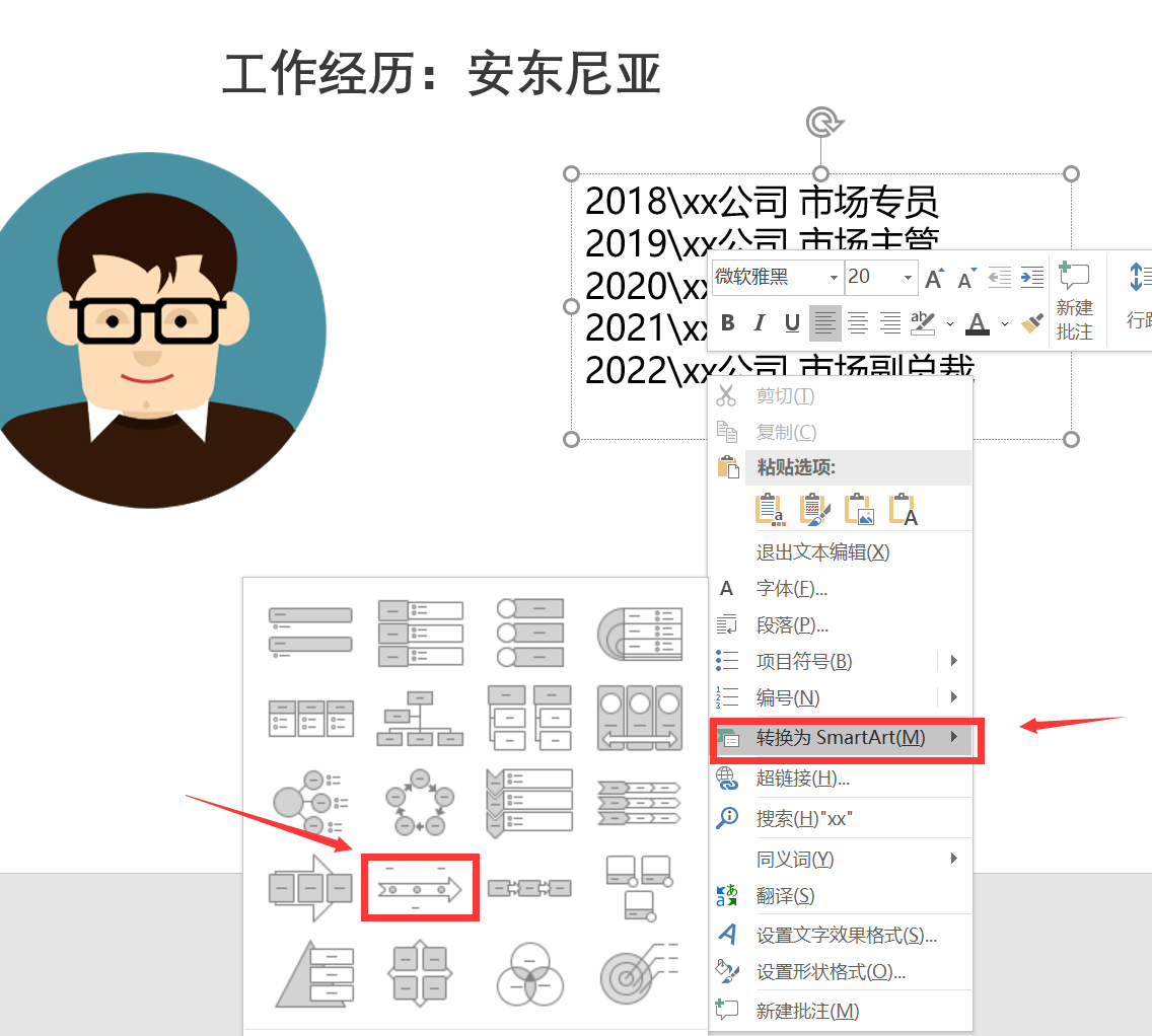 2. 点击右键——找到转换SmartArt ——时间轴。