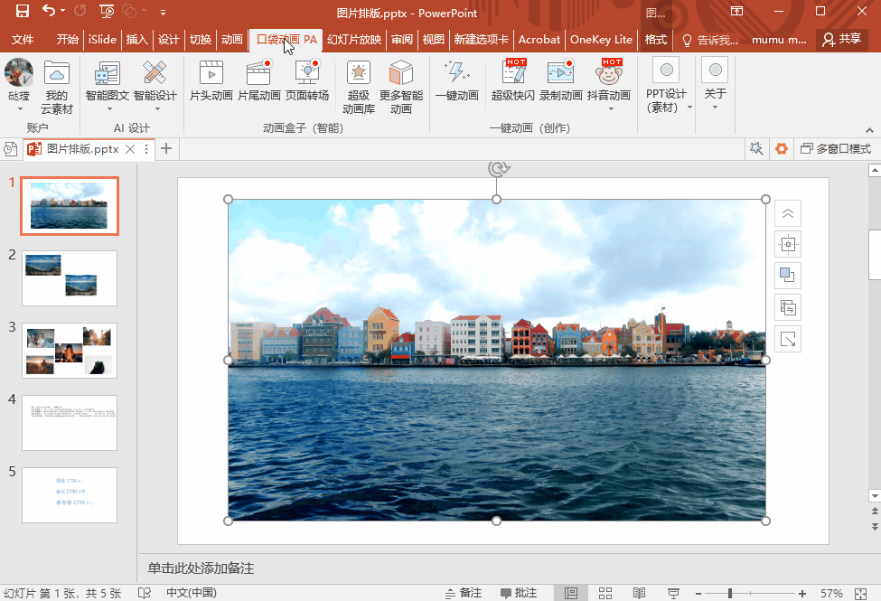 创意剪裁真的很优秀,简单处理一下,就能让你的图片变得与众不同,点击图片,选择口袋动画插件的【PPT设计(素材)】-【创意裁剪】功能,选择点击下载喜欢的图案,就可以直接套用了。
