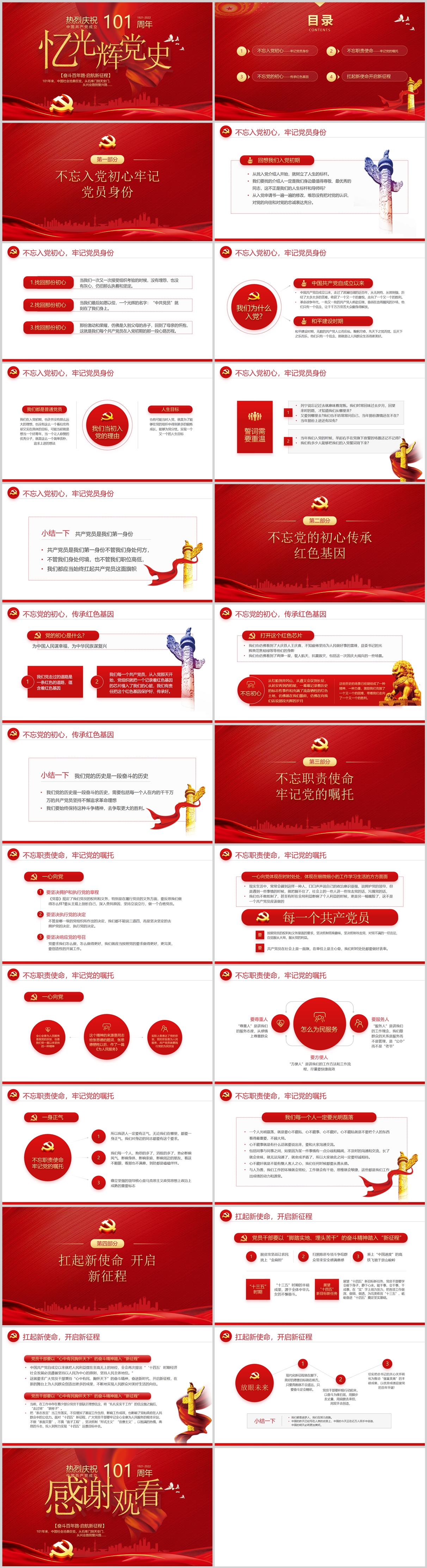 6.忆光辉党史,热烈庆祝建党101周年PPT目录:一、不忘入党初心-----牢记党员身份二、不忘职责使命-----牢记党的嘱托三、不忘党的初心-----传承红色基因四、扛起新使命开启新征程