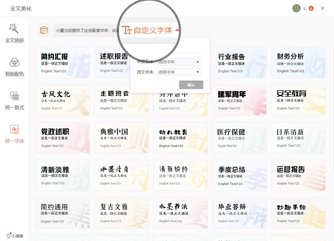 隆重介绍,WPS智能美化中的【统一字体】功能,全面升级!不仅可以一键统一整套PPT的字体,还能让字体更有个性,贴合PPT的主题风格。