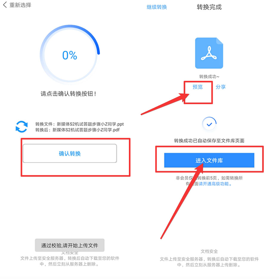 选择好文件之后就可以点击【确认转换】了,转换完成后,你可以点击【预览】,也可以点击【进入文件库】查看转换成功的PDF文件。