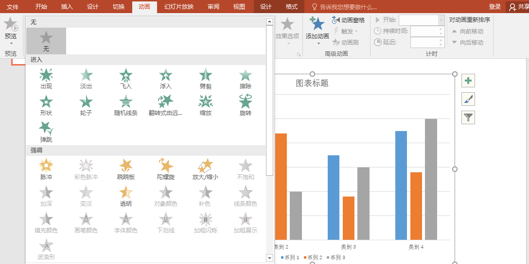 插入图表后,还可以选择为其添加动作,来增强图表的动感。PPT中有很多的动作类型,从进入到退出,种类众多,应有尽有。大家可以按照自己的喜好,以及要强调的内容进行挑选。