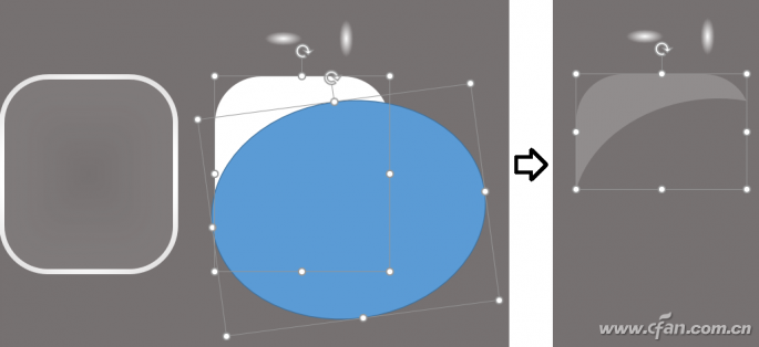 接下来制作光晕及反光效果。插入一个大小合适的椭圆,设置为无线条,内部填充为“渐变填充”,类型为“路径”。其中2个光圈:光圈1颜色为白色,透明度为0%;光圈2颜色也为白色,透明度为100%。复制它,将复制出的图形旋转90度,这样所需的光晕就制作完成了。反光的制作,首先复制出一个水晶边框,设置复制出的边框,填充为“纯色填充”,颜色为白色,无线条。接下来,再绘制一个大小适合的椭圆,使之与复制出的那个水晶边框有一定的重叠,将这两个都选中后,点击“格式”选项卡下“合并形状”中的“剪除”。选定剪除后的图形,设置其填充颜色为白色,透明度为80%,这样反光就制作完成了(图4)。
