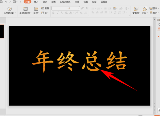 1.我们在利用WPS演示文稿进行日常办公时,经常需要在PPT当中设置各种各样的创意文字,在有晚会或者年终总结时,在幻灯片当中经常会用到烫金字体,那么烫金效果是如何制作出来的呢,今天我们就来教大家如何在WPS演示文稿当中实现这一技巧,具体怎么操作呢,一起来学习一下吧。